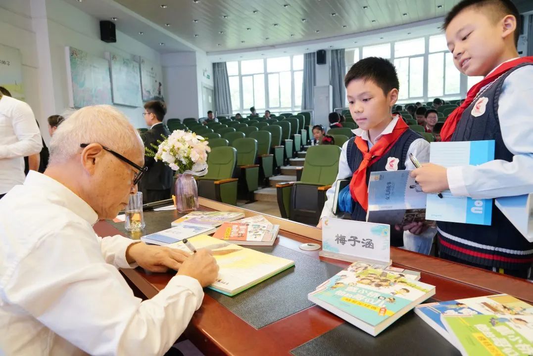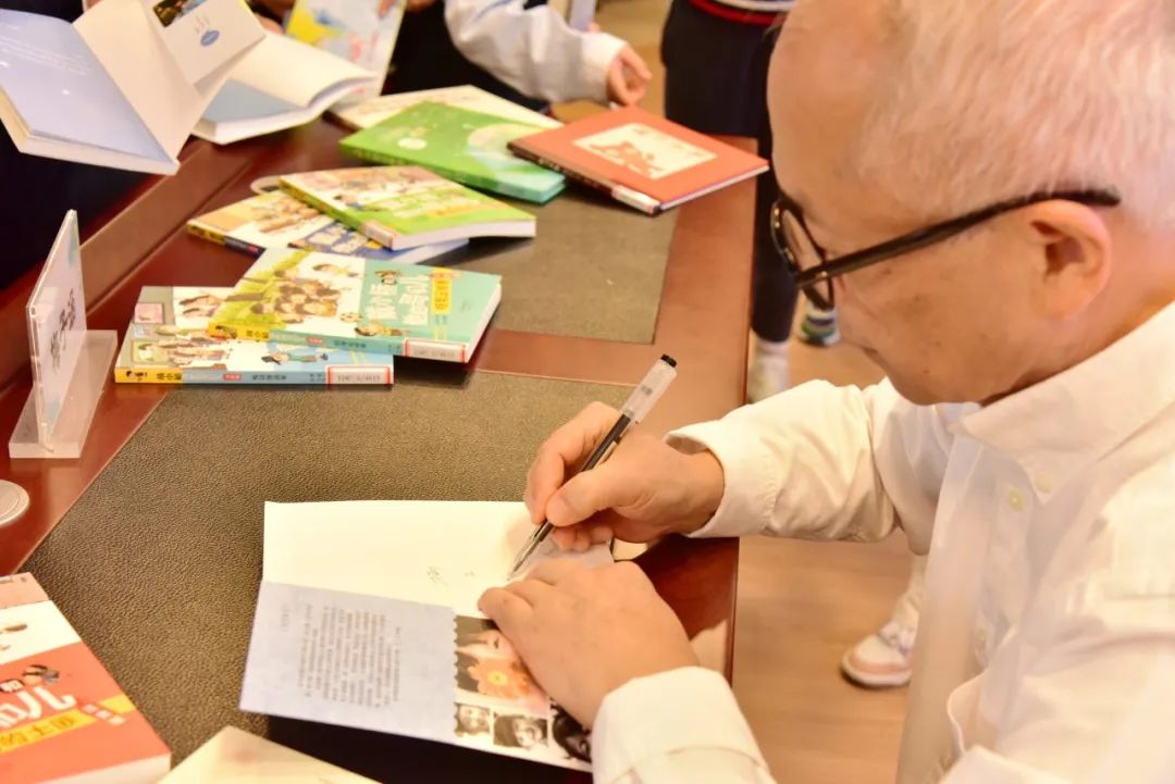 签书环节是孩子们所期待的,他们激动万分,纷纷拿上书,排好队,静静地等待着队伍的前进,慢慢地走在文学路上。每一个签名都寄托着梅教授对孩子们热爱文学的关心与期待,每一本书都承载了孩子们对梅教授的崇敬与感谢!
